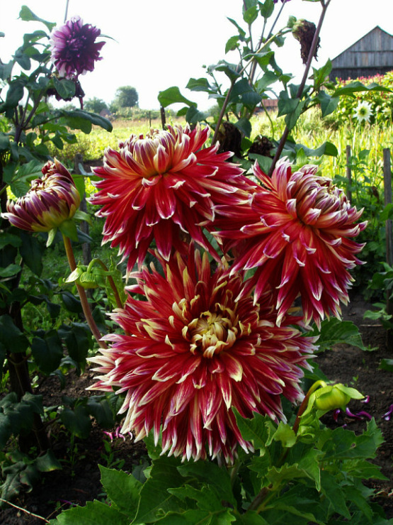 Клубни георгины махровой Акита (Dáhlia variabilis Akita) позволят вырастить на приусадебном участке куст, который с июля по сентябрь будет радовать цветами диаметром от 10 до 12 сантиметров. Цветы поражают необычной расцветкой. Основной тон лепестков красный, края украшены едва заметной белой каймой. Поэтому издали кажется, что они покрыты серебристым налетом. Высота куста достигает от 60 до 100 сантиметров. Растения высаживают одиночно или группами, их используют для создания миксбордеров. Кусты подвязывают к опоре, иначе стебли могут падать на землю под тяжестью цветков.
