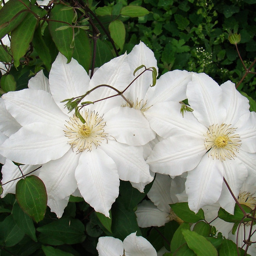 Этот сорт цветет в течение трех месяцев, радуя глаз своими крупными белыми цветками диаметром 16-18 см. Для процветания растение нуждается в поливе и опрыскивании, особенно в жаркие летние дни. Рекомендуется удобрять клематис для обеспечения его здорового роста и яркого цветения.