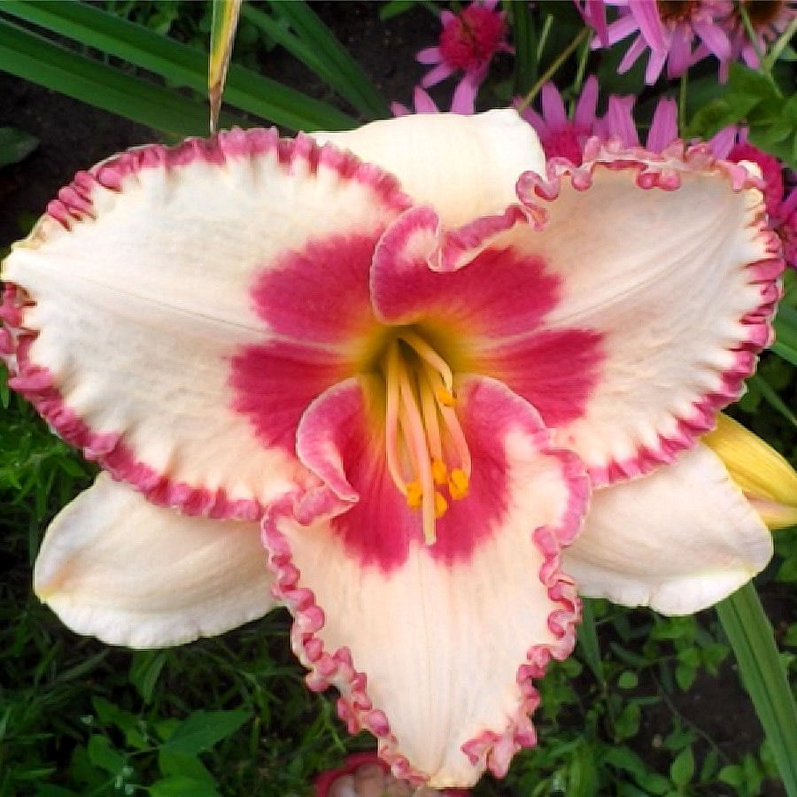 Окраска цветка : кремово-жёлтый с красной окантовкой и глазком, горло зелёное