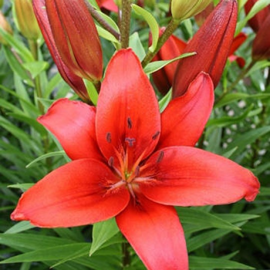 Саженцы и рассада декоративного цветка Лилия азиатская Родилана (Lilium asiatic Rodilana) любят солнечные, хорошо проветриваемые места. Главным отличием сорта от других является великолепный ярко-красный цветок из двух трехлепестковых чаш, который напоминает шестиконечную звезду. Лепестки гладкие, глянцевые без крапа. Высота взрослого растения 110 см, начинает цвести во второй половине июня. Почва для посадки должна быть хорошо дренирована, богата питательными веществами, рыхлая. Хорошо смотрится в групповых посадках, в срезанных букетах в качестве основного элемента.