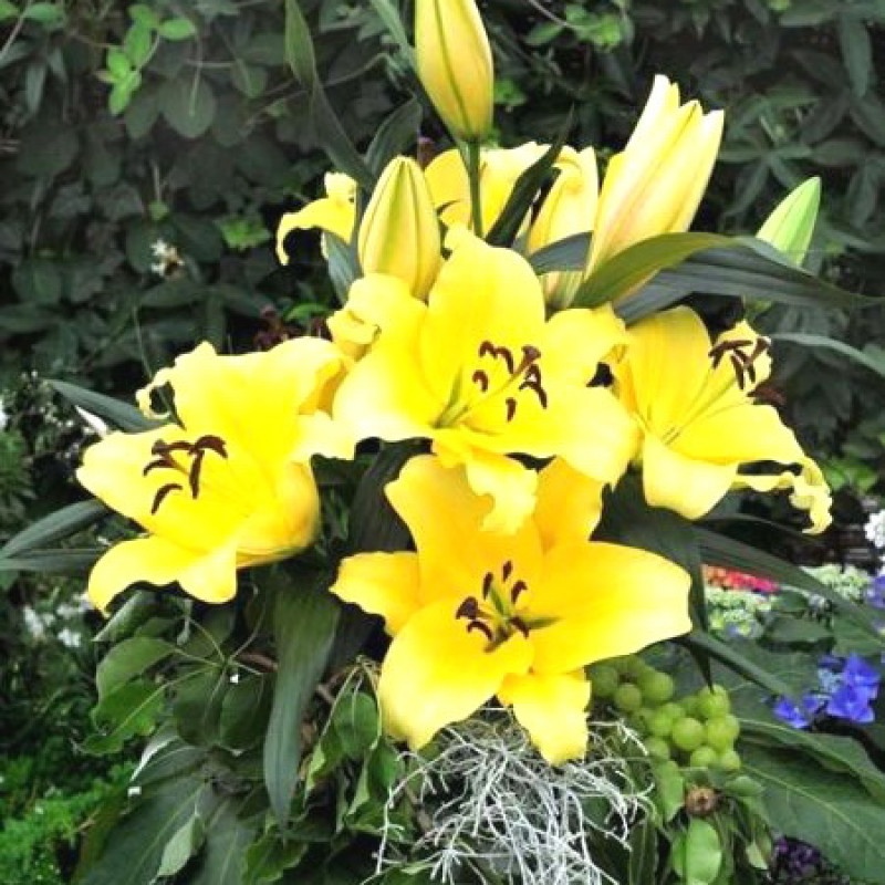 Лилия от-гибрид Фомова - это великолепное растение, которое поразит вас своей красотой и изысканностью. Ее стебель достигает высоты до 110-120 см, а цветки радуют глаз своей ярко-желтой окраской, более насыщенной у центра. Пыльники лилии коричневые, что создает удивительный контраст. Листья зеленого цвета имеют интересную форму, что делает растение еще более привлекательным.