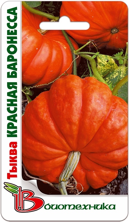 Семена тыквы "Красная Баронесса" (Krasnaia Baronessa) на рассаду высевают в мае – апреле. Пересадку в грунт проводят спустя один месяц. Сорт среднеспелый. Собирать богатый ярко-оранжевый урожай можно начинать через 105-110 дней после появления первых всходов. Тыквы имеют сплюснутую форму. Кожица гладкая, четко-сегментированная. Мякоть оранжевого окраса, плотная. Средняя масса плода достигает 5-8 кг. Урожай пригоден для потребления в сыром виде и для различной переработки. Может храниться до весны следующего года без потери вкусовых и товарных качеств.